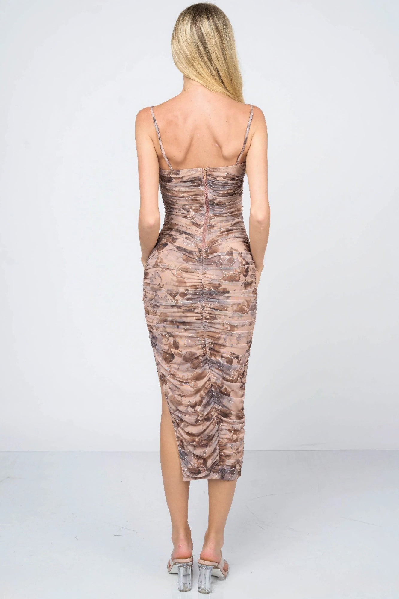 Design: The dress features a romantic floral print with mesh foil detailing, adding a touch of elegance. The sleeveless design, ruched sides, and slitted midi length create a sophisticated yet playful look, perfect for any occasion.
